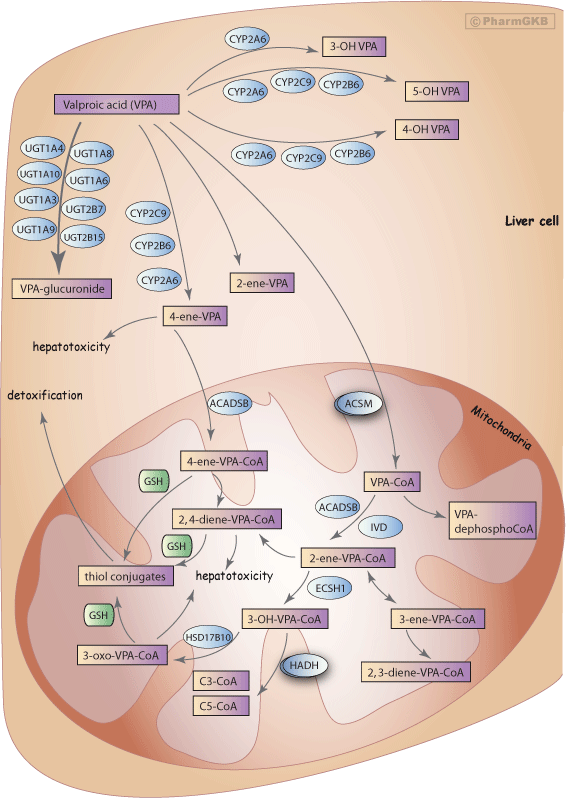 Influence of CYP2C9 genotypes on the formation of a hepatotoxic metabolite of valproic acid in human liver microsomes. The pharmacogenomics journal. 2003. Ho P C, et al.